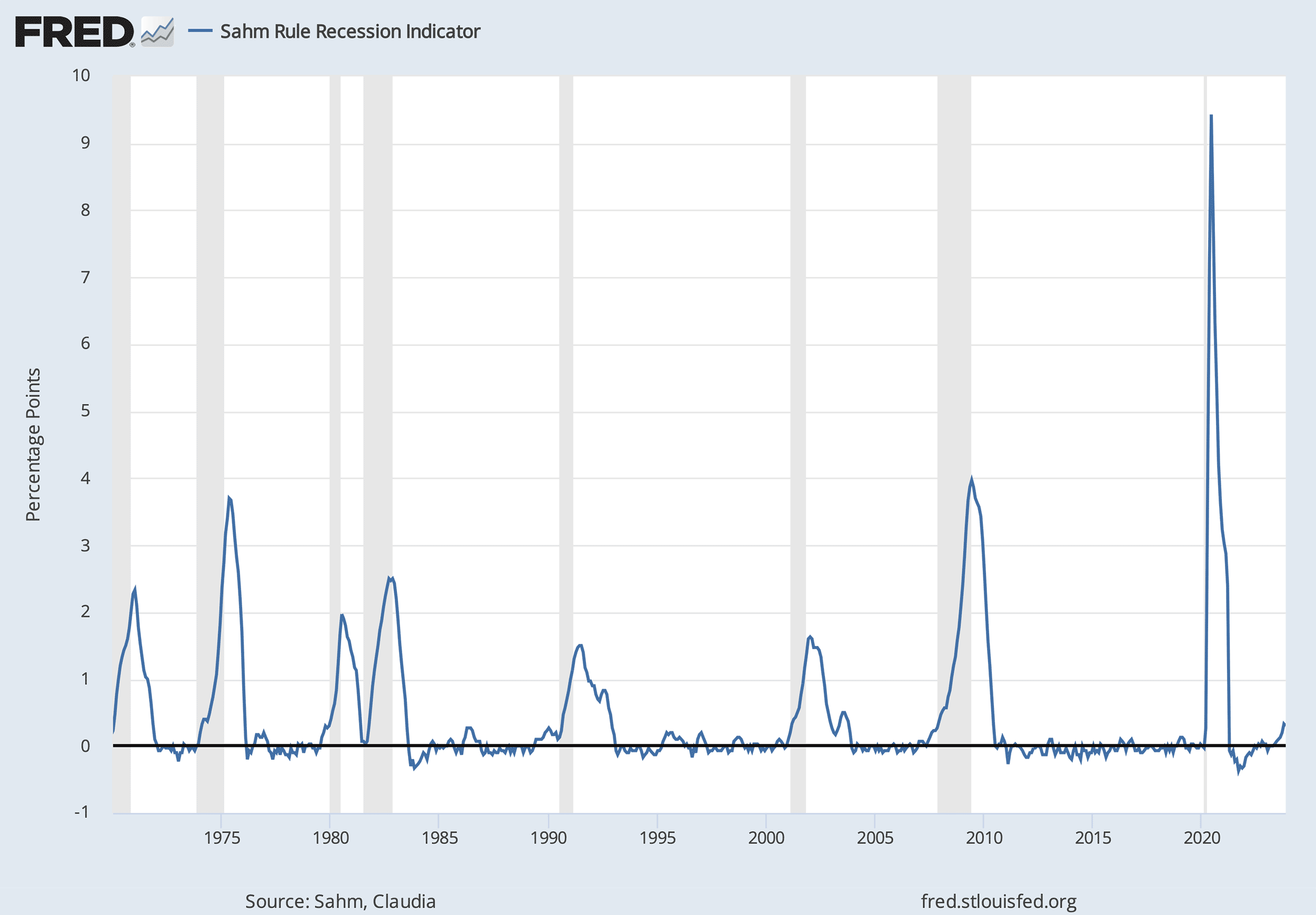 I created the Sahm rule—a widely followed and highly accurate indicator of a recession—based on labor market conditions. Specifically, if the three-month average of the unemployment rate is ½ percentage point or more above its low over the prior twelve months, then the US is in the early months of a recession. The Sahm rule has triggered within, but never outside, every recession since the 1970s.